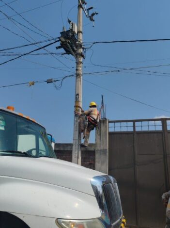 Personal del Ayuntamiento en coordinación con trabajadores de la CFE atendieron oportunamente una falla en un transformador que dejó sin servicio de alumbrado público a vecinos de la calle León Guzmán.