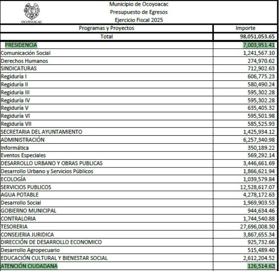 Derroche en el poder, migajas al pueblo: Ocoyoacac solo asigna 7 millones, pero solo 100 mil pesos para atención ciudadana