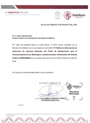 Sin embargo, nos encontramos con que no hay documentos oficiales que abalen dichos movimientos de esos recursos, en su lugar existe dos memorandum, supuestamente aclarando que aun no se ejecutan dichos recursos, estamos terminando ya el tercer trimestre y tal parece que el gobierno municipal de Xalatlaco no está haciendo la gestión correspondiente, o más bien ¿no quiere que sepamos en que se están gastando el dinero?