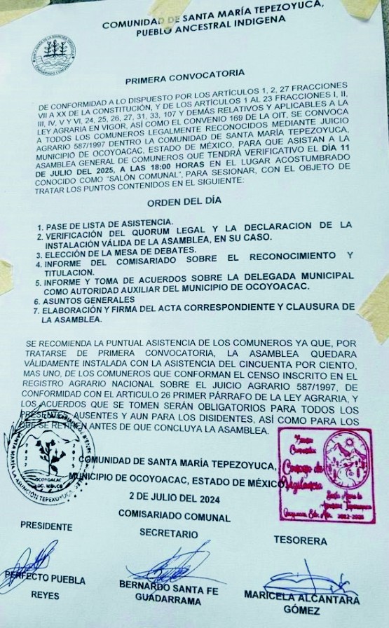 A lo anterior se suma un documento oficial rotulado como “Primera Convocatoria”, dirigido exclusivamente a los comuneros inscritos en el censo oficial, en donde se hace un llamado a sesión el 11 de julio de 2025, especificando que será en el “salón comunal”, y en el que se discutirán puntos como el reconocimiento de títulos agrarios, asuntos generales y acuerdos sobre la delegada municipal. Esta exclusividad ha levantado nuevas críticas en redes, ya que excluye a gran parte de la población, lo que ha sido interpretado como una acción deliberada para despojar al pueblo de su voz en decisiones que afectan a toda la comunidad.