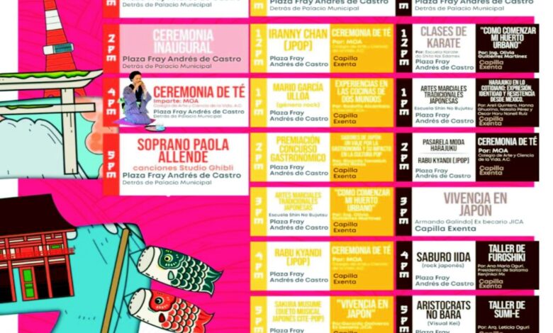La directora general de Educación, Cultura y Turismo, Victoria Sánchez, informó que el festival comenzará el jueves 1 de agosto a las 13:00 horas con la presentación del grupo de danza japonesa Ginreikai, seguido de la ceremonia inaugural a las 14:00. Más tarde, a las 16:00 horas, se ofrecerá una ceremonia tradicional del té, y a las 17:00, la soprano Paola Allende interpretará piezas icónicas de las películas de Studio Ghibli, reconocidas en todo el mundo por su sensibilidad y belleza artística.