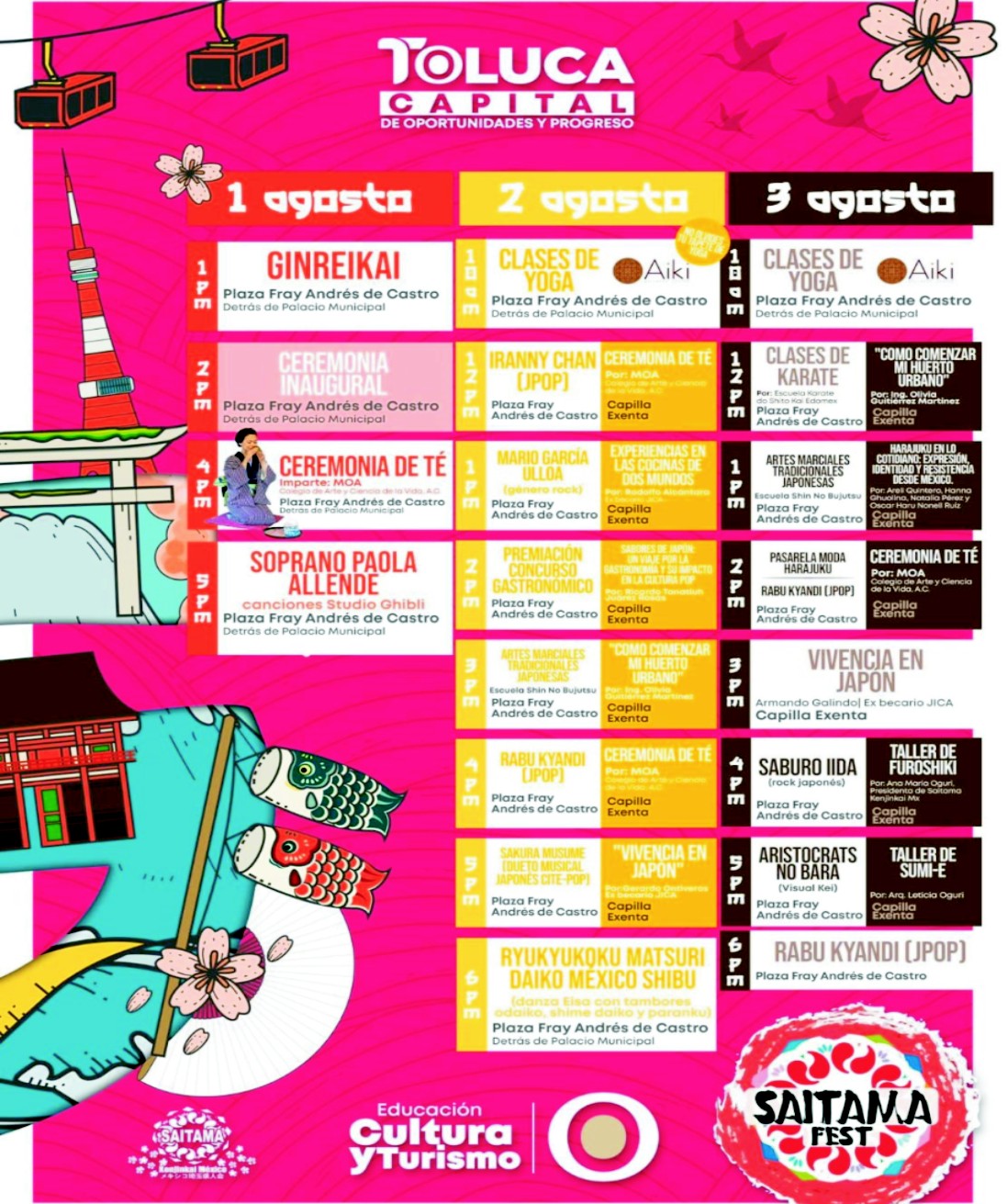 La edición 2025 del Saitama Fest se llevará a cabo los días 1, 2 y 3 de agosto en la Plaza Fray Andrés de Castro y la Capilla Exenta, ubicadas en el corazón de Toluca. Durante estos tres días, el público podrá disfrutar de ceremonias tradicionales, conciertos, talleres, muestras gastronómicas, conferencias, danzas, desfiles y actividades interactivas para toda la familia, todo de manera gratuita. El evento, impulsado por el presidente municipal Ricardo Moreno Bastida, busca no solo entretener, sino también abrir espacios de aprendizaje, tolerancia y aprecio por las culturas del mundo.