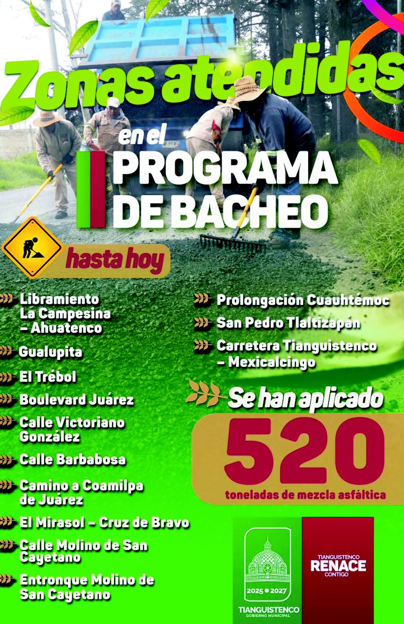 Con el objetivo de mejorar la movilidad y garantizar caminos más seguros para la población, el Gobierno Municipal de Tianguistenco continúa avanzando en el Programa de Bacheo, el cual ha beneficiado a distintas zonas del municipio.