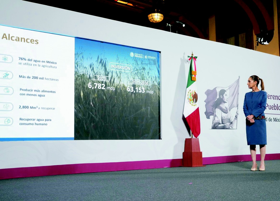 La presidenta Claudia Sheinbaum Pardo informó que el gobierno federal invierte más de 60 mil millones de pesos de 2025 a 2030 en la recuperación de agua para consumo humano a través de la tecnificación de distritos de riego. Esta acción se lleva a cabo en conjunto con las y los agricultores del país.