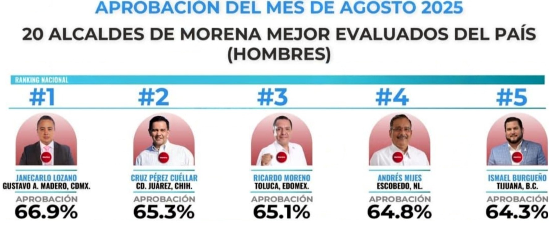 De acuerdo con el más reciente ranking de. Demoscopia Digital, el Presidente Municipal de Toluca, Ricardo Moreno Bastida, se colocó en el tercer lugarnacional entre los alcaldes de Morena mejor evaluados, al registrar una aprobación del 65.1%.El resultado lo sitúa en el grupo de presidentes municipales de Morena con mayor respaldo ciudadanoen todo el país, junto a figuras como Janecarlo Lozano (Gustavo A. Madero, CDMX) y Cruz Pérez Cuéllar(Ciudad Juárez, Chihuahua).Más allá de las cifras, este posicionamiento envía un mensaje político: en Toluca hay unaadministración que logra conectar con la ciudadanía en un contexto donde la evaluación pública es cada vezmás exigente. Con ello, la capital mexiquense aparece en el mapa nacional no solo por su peso histórico yeconómico, sino también por el desempeño de su gobierno local.Para Morena, los números reafirman que en el Estado de México se están gestando liderazgos conproyección, mientras que en Toluca la ruta es clara: gobernar con cercanía y resultados medibles. Redacción