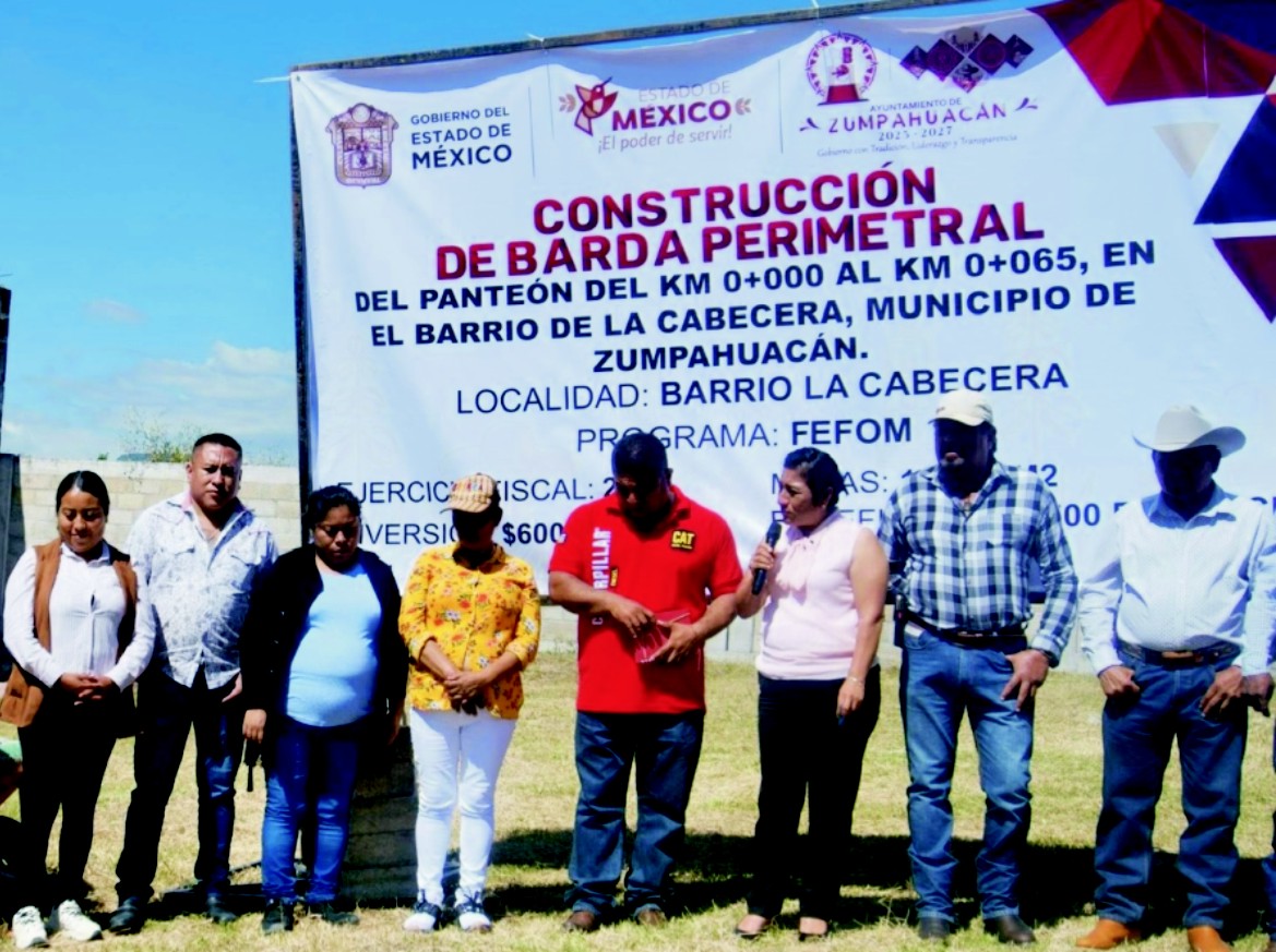 El Ayuntamiento de Zumpahuacán, encabezado por la presidenta Municipal, Myriam Álvarez Arellano, dio inicio a la construcción de una barda perimetral en el Barrio La Cabecera, con el objetivo de fortalecer la seguridad y el bienestar de las familias que habitan esta zona de la cabecera municipal. El arranque de obra contó con la presencia de integrantes del Cabildo y del equipo de la Dirección de Obras Públicas, quienes supervisarán el desarrollo del proyecto.