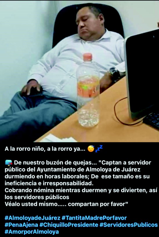 Una imagen que circula en redes sociales muestra a un presunto funcionario del Ayuntamiento tomando una siesta en horario laboral. El protagonista, recostado en su silla, parece más cómodo que en un hotel de descanso. Frente a él, una botella vacía y una computadora apagada completan la postal del “servicio público al estilo Almoloya”: cero productividad, cien por ciento confort.