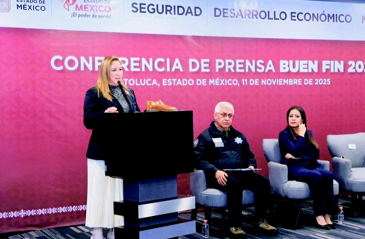En representación de los gobiernos municipales, la presidenta de San Mateo Atenco, Ana Muñiz Neyra, acompañó esta mañana a la secretaria de Desarrollo Económico, Laura González Hernández; al secretario de Seguridad, Cristóbal Castañeda Camarillo; y al secretario de Movilidad, Daniel Sibaja González, durante la conferencia de prensa donde se presentaron las estrategias integrales para el Buen Fin 2025 en el Estado de México.