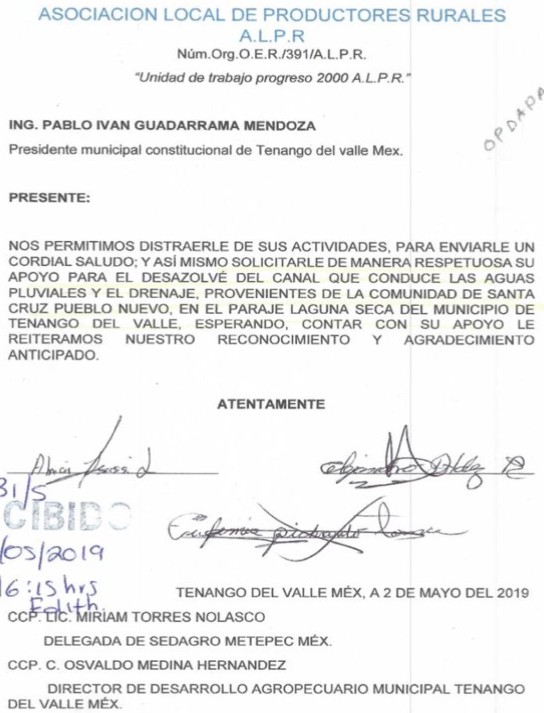 Y, de inmediato me llamo la atención lo siguiente, recuerdo que, en el año 2019, la Asociación de Productores Rurales A.L.P.R., le solicitaban al presidente municipal, de aquel entonces, su ayuda, para desazolvar, el canal que conducen las aguas pluviales, y el drenaje, provenientes de la comunidad, de Santa Cruz Pueblo Nuevo, al paraje Laguna Seca.