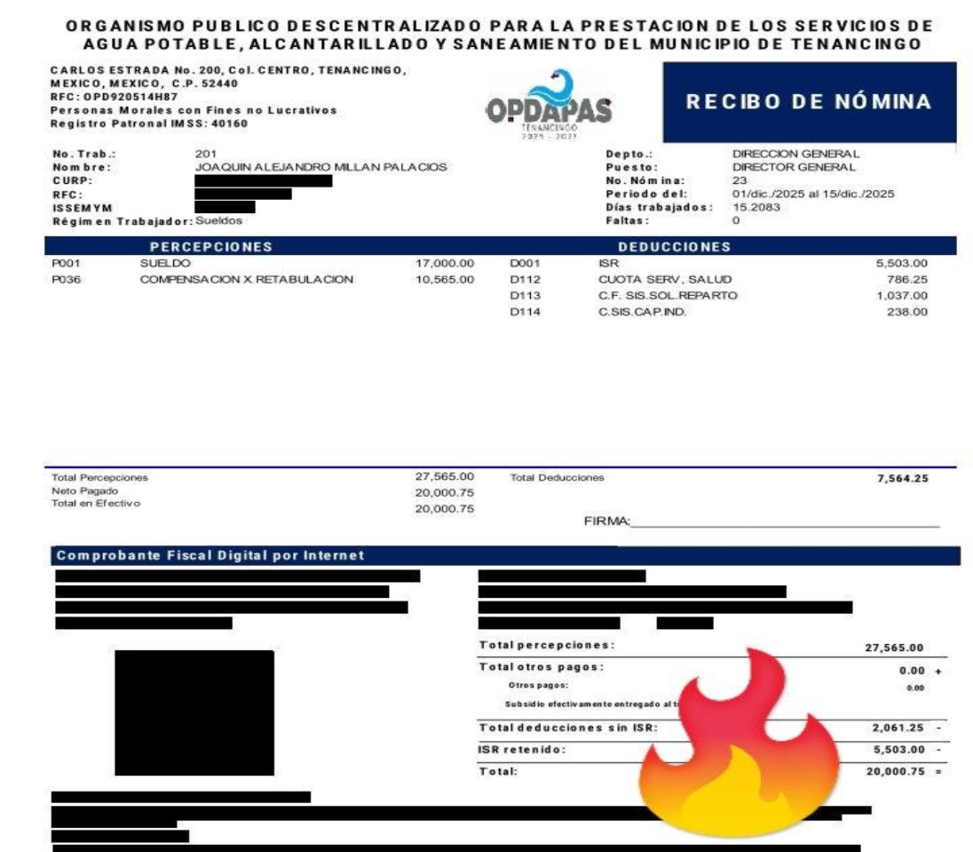 La molestia crece cuando se compara la escala salarial: trabajadores afirman que el director de Finanzas del organismo, Jesús Godofredo Ochoa, percibía ingresos similares a los del propio director de OPDAPAS, Joaquín Millán Palacios, una situación que, según denuncian, rompe cualquier jerarquía administrativa básica y evidencia que las decisiones no responden a estructura institucional sino a intereses internos, en palabras de empleados, el control real del organismo no estaba donde debía, sino en manos del tesorero y su círculo cercano.