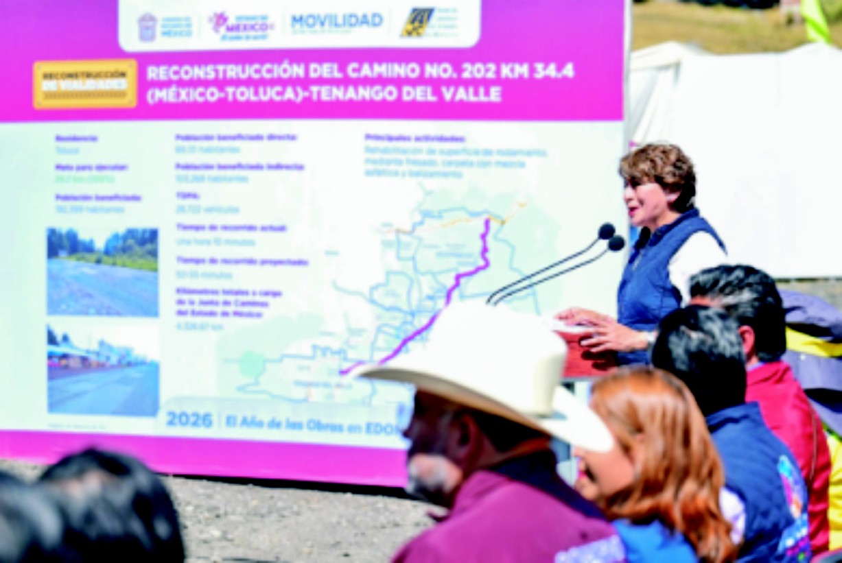 La gobernadora del Estado de México, Delfina Gómez Álvarez, anunció el inicio de la reconstrucción integral del camino 202 que conecta la carretera MéxicoToluca con Tenango del Valle, una obra de infraestructura que contempla la rehabilitación de 39.7 kilómetros y que beneficiará a miles de habitantes del Valle de Toluca.