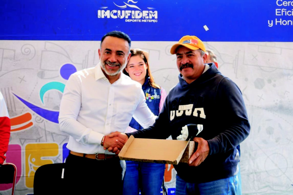 El municipio de Metepec llevó a cabo una jornada deportiva en la Unidad Deportiva San Salvador Tizatlalli, donde se realizó la entrega de más de 150 pares de tachos a jugadoras y jugadores locales, como parte de las acciones para fomentar la práctica del fútbol y fortalecer el desarrollo deportivo en la comunidad.